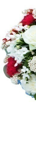 5 Red Carnations, 2 Red Gerbera, 2 White Roses, 2 White Carnations, 1 blue hydrangea, White bouvardia & Gypsophilia