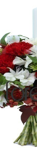 8 Red Carnations, 3 White Carnations, White Alstroemeria, Green Chrysanthemums, 1 White Candle