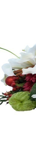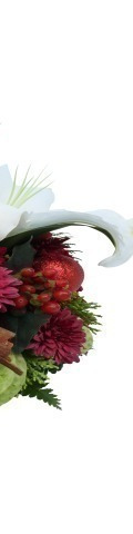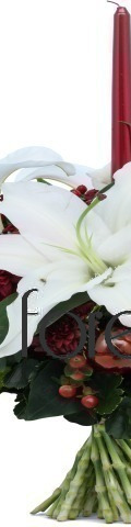 4 White Lilies, Red Chrysanthemums, 2 Balloon Flowers, Red Hypericum Berries, 4 Red Baubles, 1 Red Candle